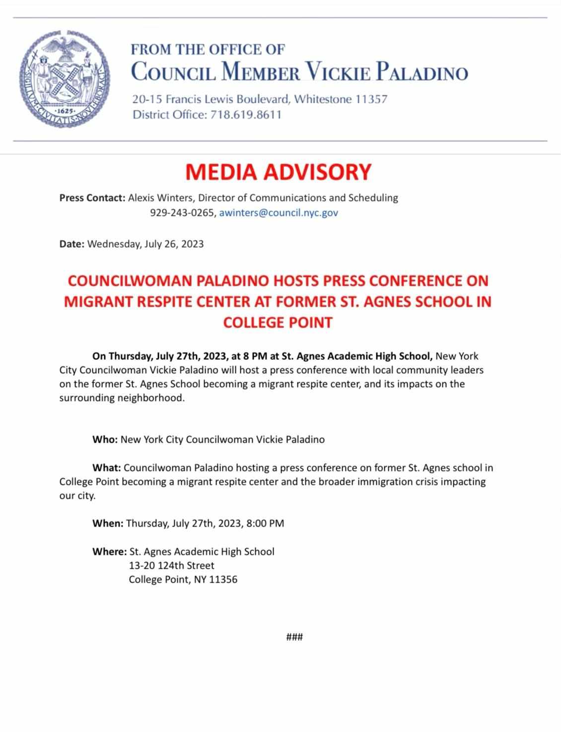 St. Agnes will be used as a “Respite Center for Asylum Seekers.” We have been told it will house 300 migrant men. As always the city puts additional strain on College Point’s infrastructure without any consideration for the residents or the overall community. The asylum seekers may move in as soon as tonight, tomorrow, or within the next 2 weeks. ABCPCA was on the phone all day getting updates from Council Member Vickie Palladino. Vickie was on the phone with the Mayor’s office all day, but the city will not change any of the plans set in motion. Vickie will be holding a press conference, please join us if you are tired of College Point ALWAYS being given the burden of supporting city initiatives and/or municipalities and never receiving any support for it!